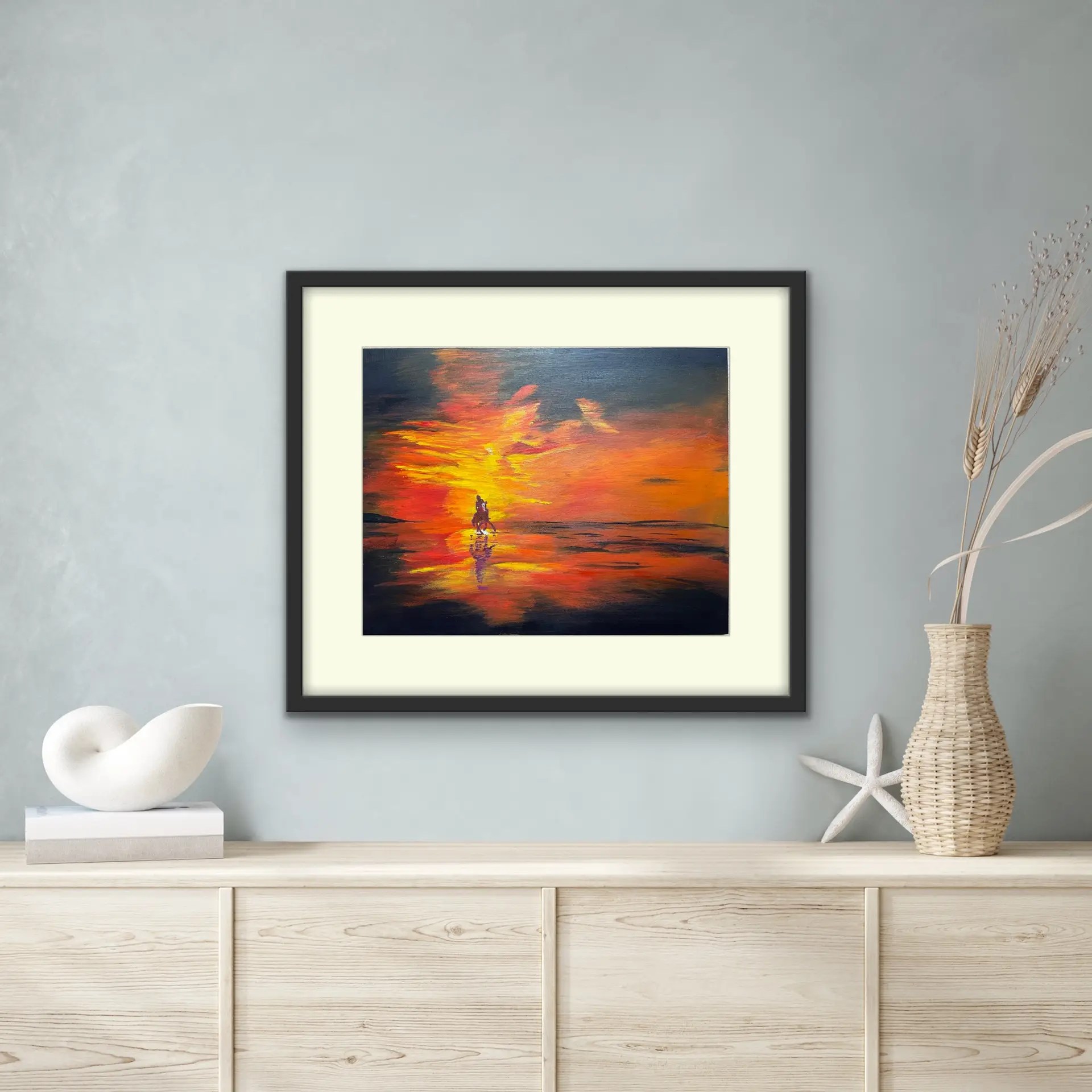In this painting I was trying to capture a sense of unfettered freedom. A moment in time – the rider and horse at sunset on a beach without any cares or restrictions – in total harmony with nature and living in and for the present moment.